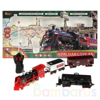 Радиоуправляемая железная дорога «Красная стрела» ТМ «Играем вместе» станет отличным подарком для ребёнка:- световые эффекты- звуковое сопровождение- длина пути 282 см- 30 деталей- дым из трубы- пульт управления Эта красочная железная дорога, состоящая из локомотива и 3-х вагонов, непременно понрав…