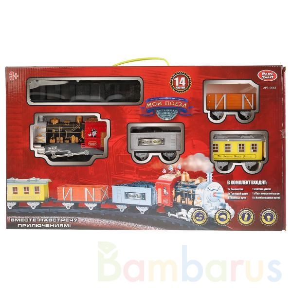 Железная дорога с поездом – мечта любого ребенка. Эта игрушка приведёт в восторг малыша и подарит ему массу незабываемых эмоций! Паровоз совсем как настоящий: он гудит, светит фарами и пускает пар. В этом наборе состав дополняют пассажирские и грузовые вагоны и цистерна. Помогайте вашему малышу собрать железнодорожные пути, вооружайтесь пультом управления и отправляйтесь в интереснейшие путешествия! Игрушка сертифицирована, укомплектована батарейками. Рекомендуется для детей старше 3 лет.