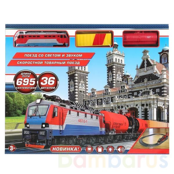 Железная дорога «Скоростной товарный поезд» ТМ «Играем вместе» порадует своего владельца реалистичным дизайном и функциональностью:- световые эффекты- звуковое сопровождение- локомотив, два вагона в комплекте- 36 деталей- длина пути: 695 смЖелезная дорога – подарок, от которого ребёнок точно придёт…