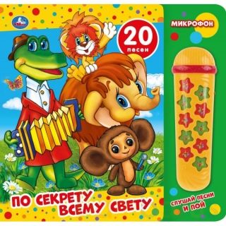 Ребёнок придёт в восторг от такой книги, дополнительно оснащённой музыкальным микрофоном. Малыш будет с удовольствием листать яркую книгу с текстами песенок и изображением персонажей известных советских мультфильмов, а также играть с микрофоном, который воспроизводит весёлые песенки, и петь вместе с ним, представляя себя настоящим артистом.