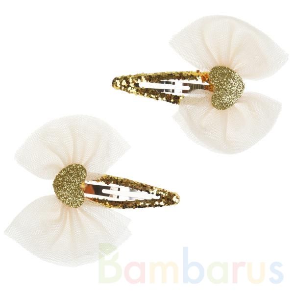 Девочки всегда хотят быть красивыми, сверкающие заколки золотистого цвета, украшенные бантиками и дополнительно декорированные переливающимися тысячами мелких блёсток сердечками, выделят ребёнка среди других детей и сделают образ маленькой леди стильным и неповторимым. Заколки хорошо держатся на волосах и позволяют создавать самые разные причёски.