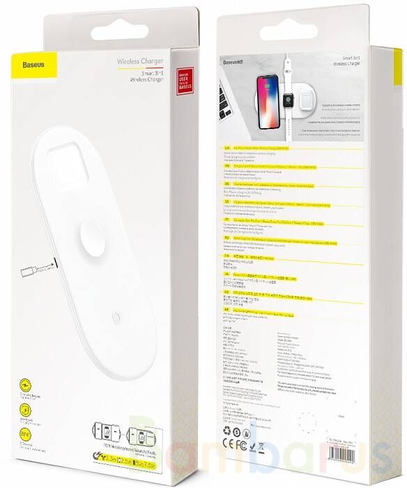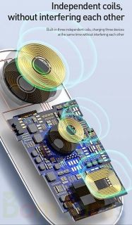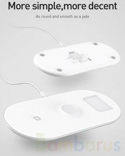 Baseus Smart 3in1 WX3IN1-02 представляет собой беспроводное зарядное устройство для трех портативных девайсов, например смартфона, умных часов Apple Watch и зарядного кейса AirPods. Оно имеет компактный корпус, который не займет много пространства. Поддержка функции быстрой зарядки позволит пополнить заряд батареи смартфонов за считанные минуты. Выходная мощность ЗУ может иметь значение 2.5, 5 или 7.5 Вт в зависимости от заряжаемого девайса.