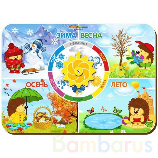 Приятное дополнение: кроме времён года, можно также изучать с ребёнком и погодные условия – ясно, облачно, ветер, зима, весна. Интересные вращающиеся детали (солнышко-часики) точно заинтересуют ребёнка, и процесс познания быстро и легко станет и для вас, и для него – весёлой, приятной игрой.