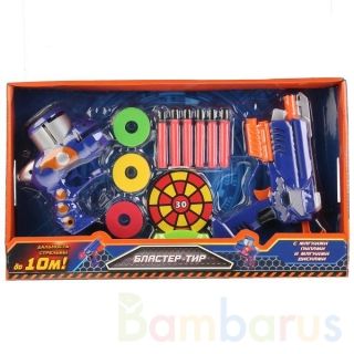 БЛАСТЕР - ТИР ИГРАЕМ ВМЕСТЕ С МЯГКИМИ ПУЛЯМИ НА ПРИСОСКАХ, ДИСКАМИ И МИШЕНЬЮ В РУСС. КОР. 37,5*21,5*4,2СМ в кор.2*24шт Игровой набор «Бластер-тир» с мягкими пулями - новая игрушка ТМ «Играем вместе», которая понравится каждому мальчику. Детали набора изготовлены из высококачественных ударопрочных материалов. В комплект входят два бластера: для стрельбы пулями и дисками, мишень на подставке, 6 мягких пуль и диски. Игры с набором способствуют развитию фантазии, чувства ответственности, координации движения и мелкой моторики рук. Дальность стрельбы достигает 10 метров. Качество игрушки подтверждено сертификатом РОСТЕСТ. Рекомендовано к использованию детьми старше 3 лет.