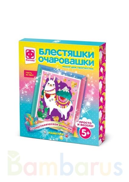 Набор для творчества «Блестяшки-Очаровашки» – картина из пайеток «Гость из Перу» с голографической фольгой.В наборе: фольга, пайетки, цветная основа с клеевым слоем, объёмная рамка, деревянный стик, клеящие элементы, инструкция.Как получить свою картинку:1. нужно создать объёмную аппликацию, подбир…