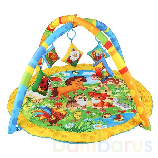 Весёлые игрушки с пищалками и яркие цвета позволят надолго увлечь малыша. Игрушки крепятся к дугам, которые устанавливаются сверху. Когда ребёнок подрастёт, дуги можно снять. В комплект также входит удобная сумка, чтобы можно было взять коврик с собой, например, на дачу.
