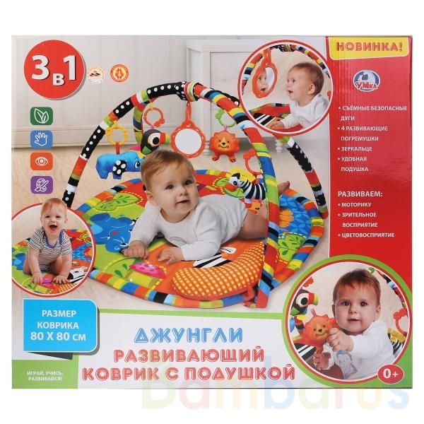 Игровой коврик 3 в 1 «Джунгли» ТМ «Умка» — увлекательная развивающая площадка для новорождённых. Особенности:- 4 мягкие съёмные игрушки-пищалки в виде жителей джунглей- 2 съемные дуги- специальное зеркальце- удобная подушка- упакован в удобную сумочкуЗвуковые эффекты и яркие цвета позволять увлечь …