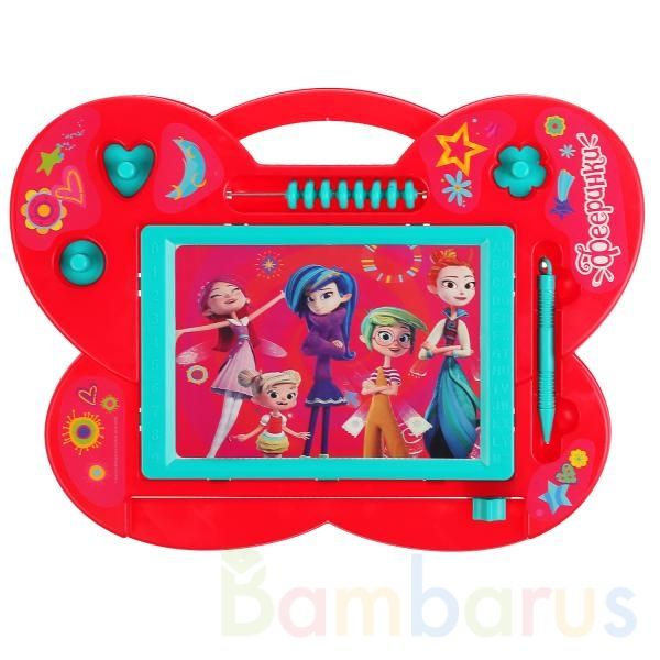 На яркой магнитной доске с изображениями любимых героинь из мультсериала «Фееринки» рисовать ещё интереснее! Если закончилось место, просто сотрите нарисованное специальным рычагом снизу. Досочка снова чистая, и можно продолжать творить! Удобная ручка позволяет брать её с собой на прогулки и в поездки.