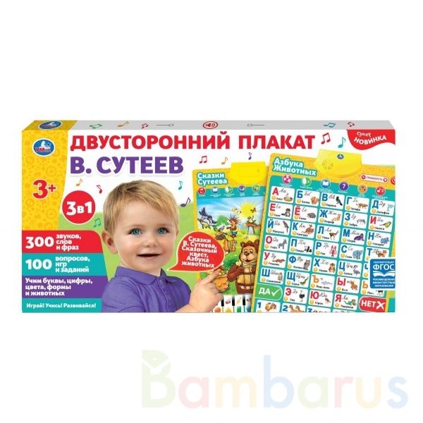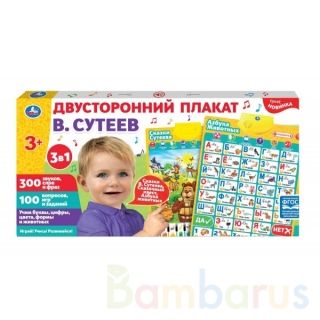 Двусторонний обучающий плакат 3 в 1 «В. Сутеев» ТМ «УМка» порадует вашего ребенка красочным дизайном и своим функционалом: