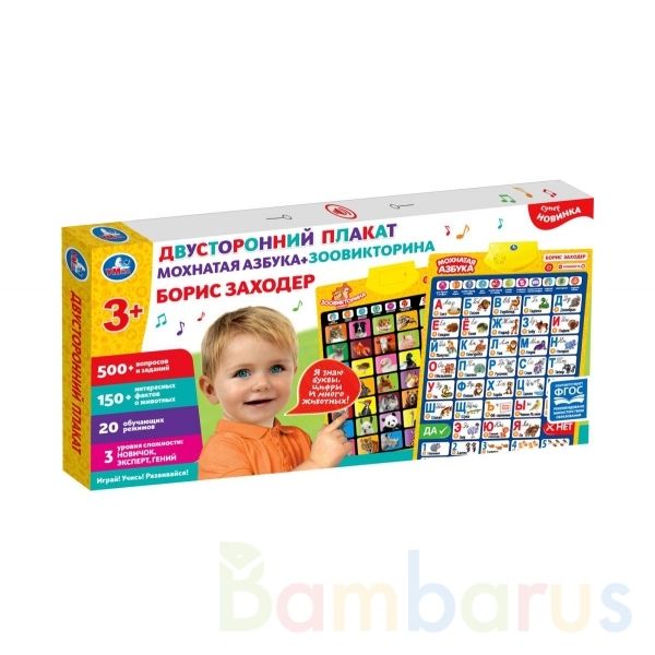 Двусторонний обучающий плакат «Б. Заходер. Мохнатая азбука. Зоовикторина» ТМ «УМка» порадует вашего ребенка красочным дизайном и своим функционалом: