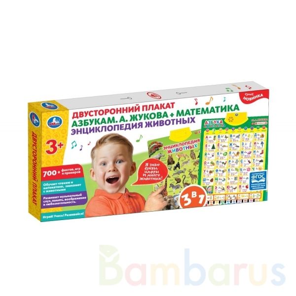 Двусторонний обучающий плакат 3 в 1 «Азбука М. А. Жукова + математика. Энциклопедия животных» ТМ «УМка» станет прекрасным обучающим подарком для маленького любознайки: