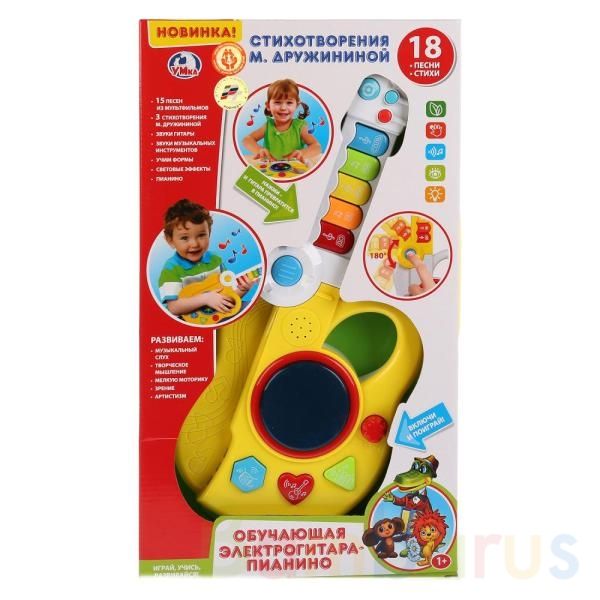 Обучающая игрушка «Электрогитара-пианино» ТМ «УМка» - замечательный подарок для ребёнка:- 15 песен из м/ф: «Карусель», «Песня Чебурашки», «Песня Трубадура», «Чунга-чанга», «Песня мышонка», «Песня мамонтёнка» и др.- 3 стихотворения М. Дружининой: «На полянку, тили-дили», «Ты возьми-ка, зайка», «Ля-…