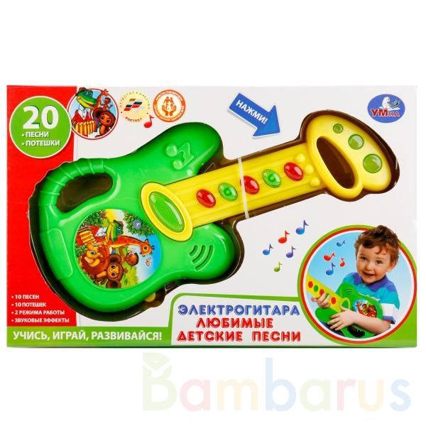 Детская электрогитара "УМКА" - это развивающая музыкальная игрушка, которая поможет раскрыть музыкальные способности ребёнка. Корпус выполнен из легкого пластика, гитару удобно держать в детских ручках. Игрушка имеет 2 режима работы - проигрывает песни и воспроизводит звуки гитары. Нажимая на разноцветные кнопочки, ребёнок сможет прослушать 10 песен из любимых мультфильмов и 10 русских народных потешек. Подпевая им, малыш представит себя в роли настоящего гитариста, выступающего на сцене. Детская электрогитара "УМКА" тренирует мелкую моторику рук, развивает музыкальный слух, артистизм и память ребёнка. Сделана из прочного высококачественного безопасного пластика. Качество подтверждено аттестатом Ростест. Рекомендована психологами. Предназначена для детей от 3 лет. Работает от батареек.
