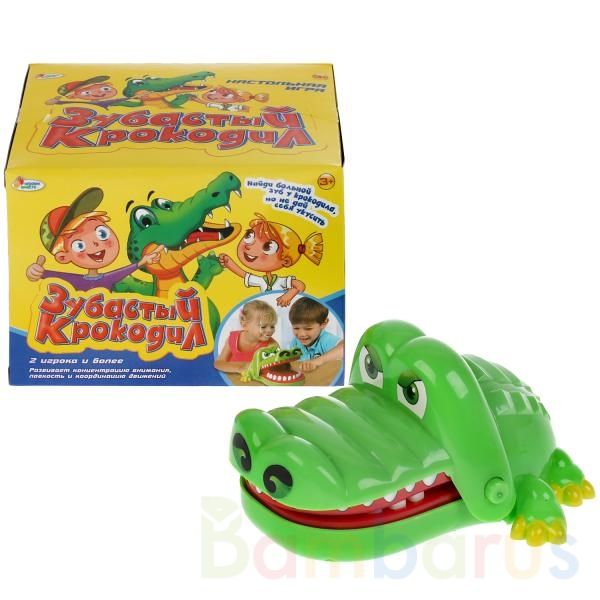 Настольная игра "Зубастый крокодил" позволит весело и динамично провести время. Цель игры - найти у крокодила больной зуб, но при этом не дать себя укусить! Игра развивает внимание, ловкость и быстроту реакции, ведь самое важное вовремя убрать палец из пасти хищника. Фигурка крокодила с открывающейся и неожиданно захлопывающейся пастью приведёт в восторг детей. В игре могут участвовать 2 и более игроков. Качество подтверждено аттестатом Ростест. Рекомендовано детям от 3 лет.