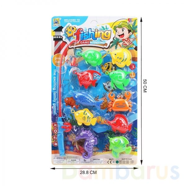 Яркая и удобная удочка легко захватывает разноцветных рыбок за специальные колечки на голове. После того, как рыбка попадётся на крючок, ребёнок может «вытащить улов». С таким набором здорово играть в ванной и на свежем воздухе.