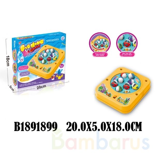 В «пруду» вертикально помещаются 8 ярких рыбок. При включении круглая подставка игрушки начинает вращаться, а рыбки открывать и закрывать ротики. Задача маленького рыбака - успеть поймать рыбок на «крючок» и поскорее вытащить. Четыре удочки из комплекта позволят устроить весёлое соревнование и определить лучшего рыбака. Процесс рыбной ловли сопровождается весёлой музыкой.