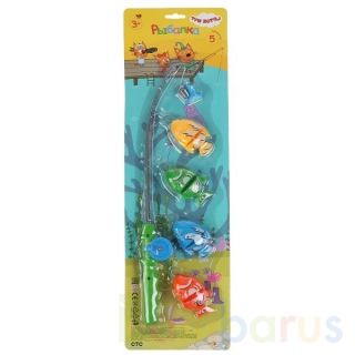 Яркая и удобная удочка с катушкой, регулирующей леску, легко захватывает разноцветных рыбок за кольца во рту. После того, как рыбка попадётся на крючок, ребёнок может «вытащить улов». С этим набором здорово играть в ванной и на свежем воздухе.