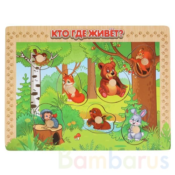 Развивающий деревянный набор-игрушка со вкладышами «Лесные животные. Чей домик?» ТМ «Буратино» состоит из: