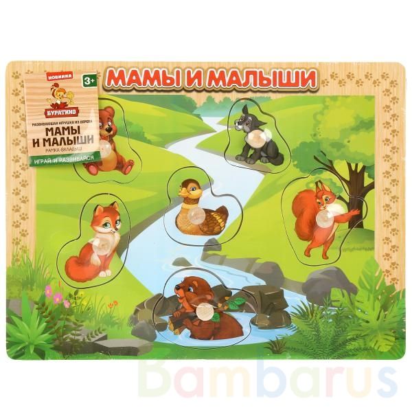 Деревянная игрушка-вкладыши «Животные. Мамы и малыши» ТМ «Буратино» – увлекательная и полезная игра для вашего любознайки. Играя, дети вставляют вкладыши с изображением животных в специальные углубления на пластине-основе так, чтобы все животные нашли своих малышей и сложилась завершенная картинка…