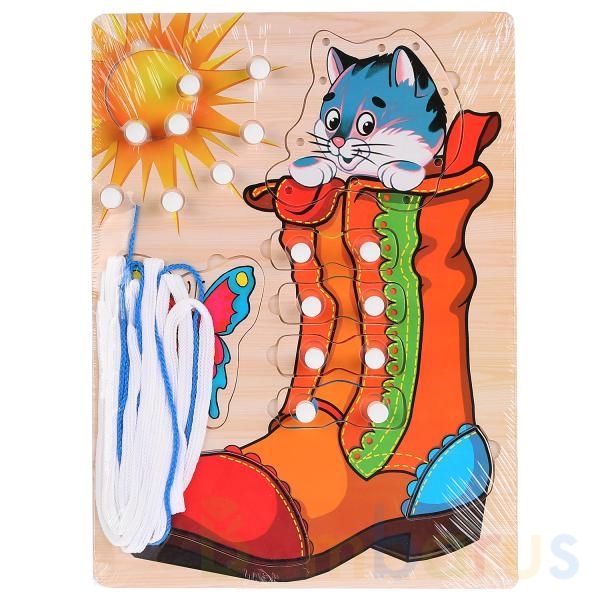 Деревянная игрушка-шнуровка «Ботинок» ТМ «Буратино» – увлекательная и полезная игра для вашего малыша.Игрушка состоит из:- деревянной пластины с иллюстрацией сапога, слонца, клубочка ниток и гусенички на цветочке- мордочки котёнка- бабочки- солнышкаВ белых выпуклых фигурках находятся отверстия для …