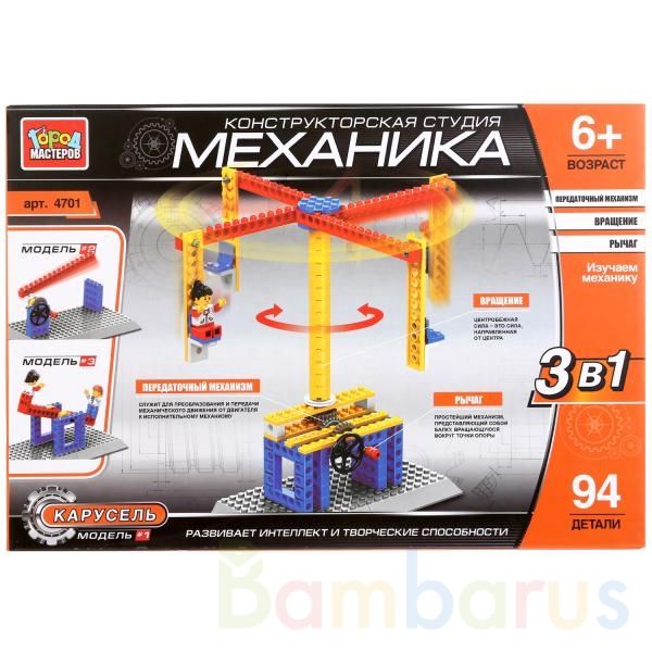 Конструктор "Механика: карусель" 3 в 1 - это новый уникальный набор ТМ "Город мастеров". В него входит рычаг, передаточный механизм и другие мелкие детали. Они необходимы, чтобы собрать карусель или другие две модели и показать ребёнку работу механического механизма. Всего в наборе 94 детали. Развивает интеллект и творческие способности. Рекомендуется детям от 6 лет.