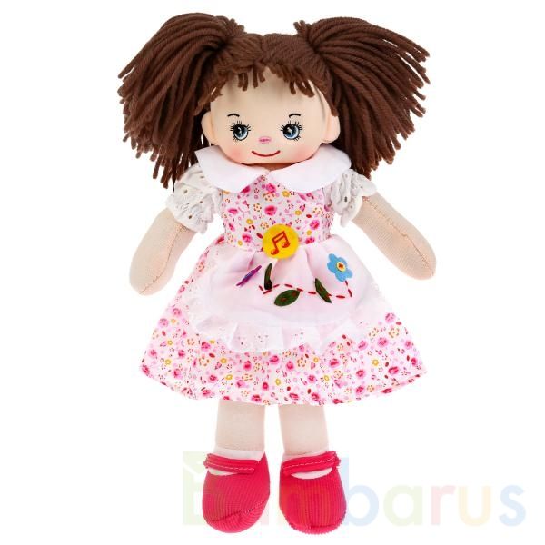 Очаровательная куколка одета в красивое платье с цветочным принтом, которая декорировано рукавами-фонариками и передником, на её ножках мягкие розовые туфельки. Каштановые волосы куколки собраны в два стильных хвостика. Игрушка очень мягкая на ощупь, ее приятно обнимать. Эта милая мягкая куколка станет для ребёнка хорошим другом, с которым можно придумать много новых сюжетов для игр.