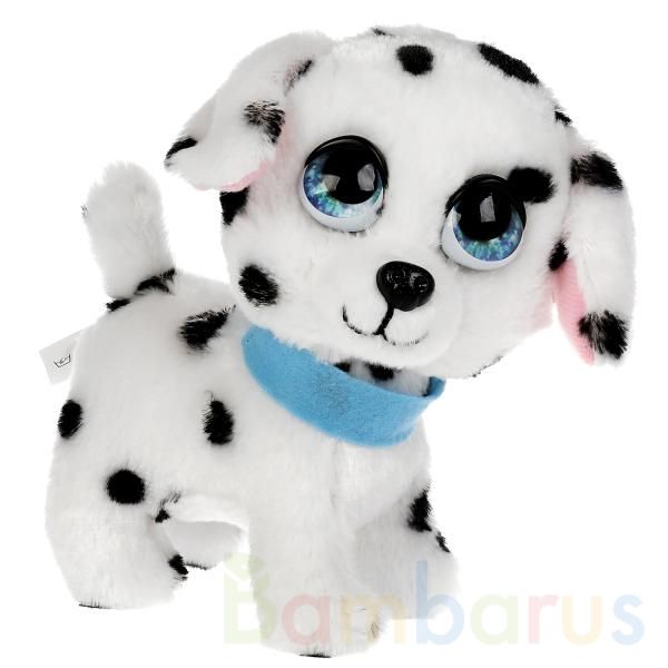 Пятнистая шёрстка собачки сделана из мягкого материала, поэтому игрушку очень приятно обнимать и гладить. У питомца очаровательная мордочка с голубыми глазами м длинными ушами, которая вызовет у ребёнка самые трепетные чувства. На шее далматинца - голубой ошейник. Компактный размер позволяет брать щенка с собой на прогулку или в гости.