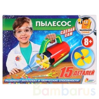 С этим увлекательным набором ребёнок самостоятельно или с помощью родителей сможет собрать настоящий пылесос. Готовое изделие можно использовать в своих дальнейших играх, придумывая увлекательные сюжеты.