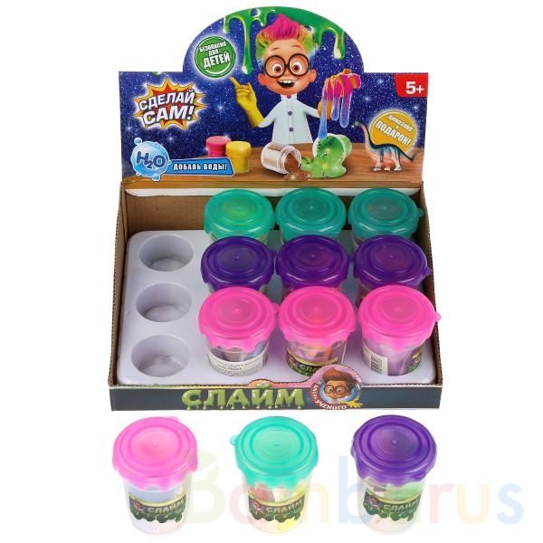 Стоит только добавить в баночку с веществом для изготовления слайма воды и действовать по инструкции – и он готов! В набор входит фигурка динозавра, Приятный на ощупь полимерный слайм яркого цвета с блёстками можно растягивать, дуть, мять, тянуть, лепить, жать, не боясь повредить их. Можно использовать как антистресс и попрыгунчик.