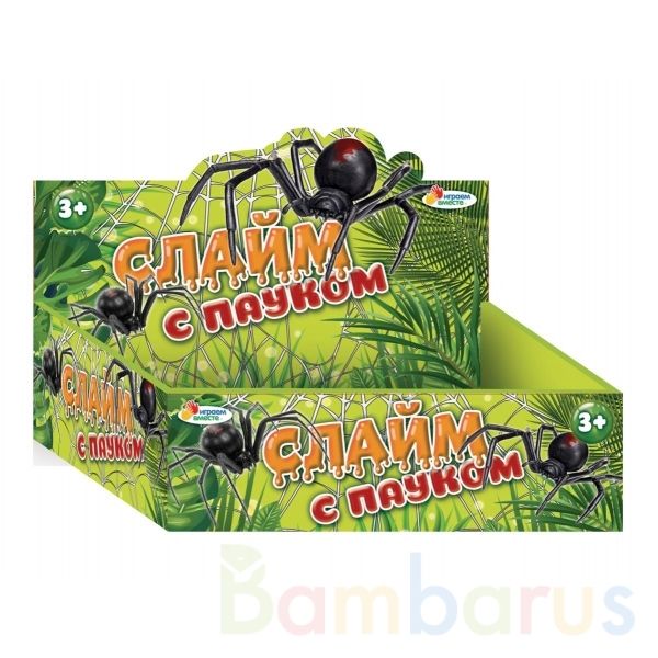 Слайм хорошо растягивается, а при резком воздействии рвется. В спокойном состоянии он медленно растекается по поверхности, но затем легко собирается руками. Яркая игрушка обязательно понравится юным любознайкам, а фигурка паука, которую они найдут внутри, приведёт их в полный восторг.