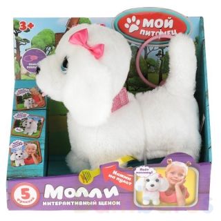 Этот очаровательный щенок совсем как настоящий. У Молли красивые глазки и умилительная мордочка. Шерсть щенка белого цвета очень приятная на ощупь. На Молли надет стильный розовый ошейник из блестящего материала и два бантика на ушках. Милая игрушка подарит малышу массу положительных эмоций и научит заботиться о домашнем любимице.