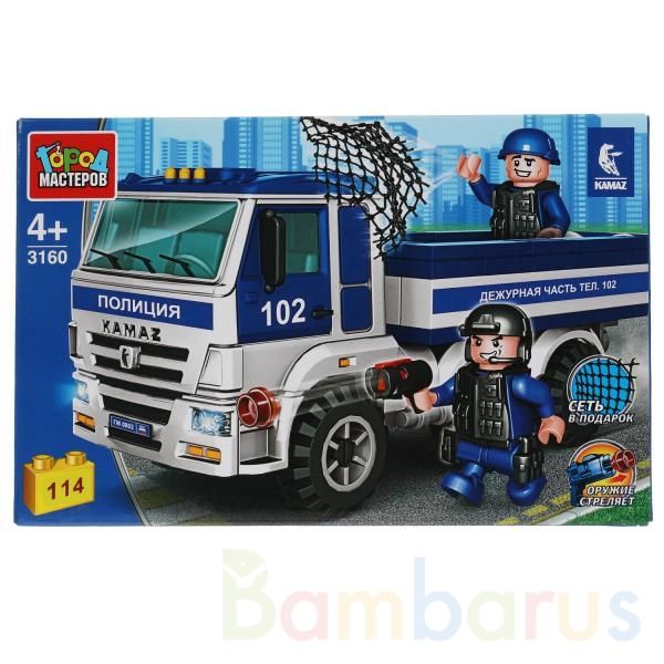 Конструктор «Полицейский КамАЗ» ТМ «Город мастеров» понравится маленькому защитнику правопорядка.Особенности и комплектация:- 114 деталей- 2 фигурки- сеть в подарок- оружие стреляет- совместим с моделями конструкторов мировых брендов- все детали легко и плотно соединяются между собойС помощью этого…