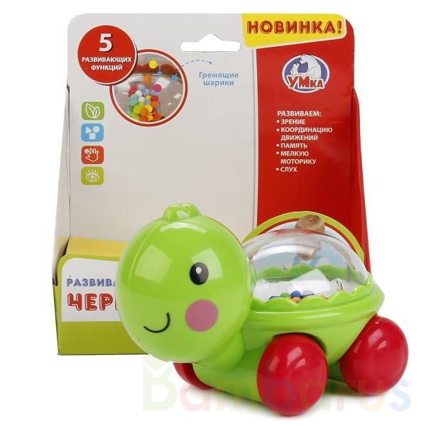 Развивающая игрушка "Черепашка" - это новинка от ТМ "Умка". Она сделана в виде каталки, снизу на туловище есть 4 больших колеса. Панцирь прозрачный, внутри него находятся гремящие шарики. Развивает зрение, координацию движений, память, мелкую моторику и слух. Рекомендуется детям от 1 года.