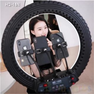 Лампа-кольцо HQ-18N с универсальным дизайном дополнит интерьер в любом стиле. Рабочий кабинет косметолога или “логово” блогера — не важно. Эффектное кольцо с имитацией автомобильной покрышки с обратной стороны и глянцевым корпусом с внешней не нарушит гармонии. Led-кольцо крепится на регулируемом по высоте штативе. Три держателя для смартфонов не портят вид, но добавляют возможностей. Кнопки управления замаскированы на обратной стороне кольца.