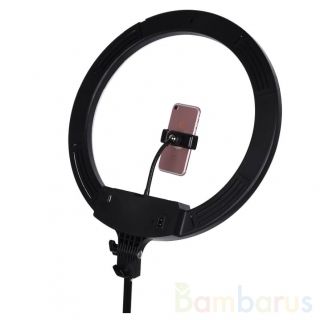 Кольцевая лампа оснащена с кругленным рассеивателем, который дает мягкий и равномерный свет. Внешний диаметр лампы - 36 сантиметров, внутренний - 26 сантиметров. Она работает в трех температурных режимах: холодном, теплом и нейтральном/смешанном. В каждом из них доступна плавная регулировка яркости свечения. Выбрать нужный режим и установить яркость вы сможете с помощью удобного пульта дистанционного управления (димметра), не подходя к лампе и не отрываясь от работы.