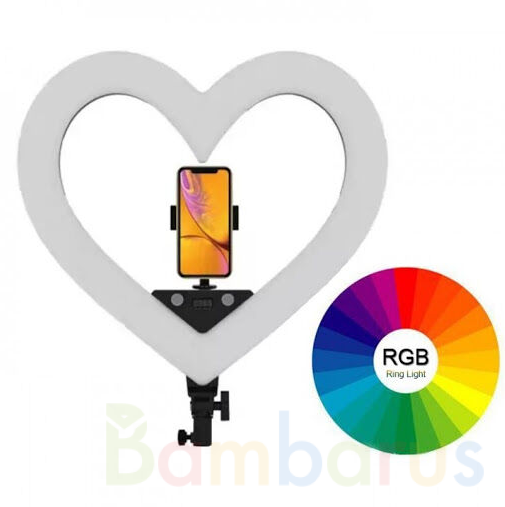 Кольцевая светодиодная лампа в виде сердца на штативе предназначена для настройки правильного света при проведении фотосессий (для фото лица - макияж, прическа и т.д.).Поддержка RGB многоцветного режима освещения (переключаемый цвет), режим теплого света, режим белого света и нейтральный режим освещения, чтобы удовлетворить любые потребности в освещении. Светодиоды, в зависимости от выбранного режима, осветят ваше лицо мягко и аккуратно, либо подарят студийную подсветку, или же, дадут освещение, подобное ярким софитам. Кольцевая лампа с держателем для телефона отлично подойдет для селфи. Стандартные режимы подсветки - теплый белый, холодный белый, смешанный. Лампа имеет дополнительные режимы работы - разные цвета, мерцание.