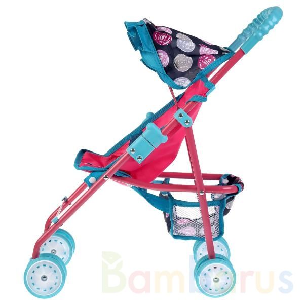 Коляска сделана из облегчённых материалов, чтобы ребёнок мог самостоятельно переносить её. Имеет оригинальный дизайн из трёх тканей-компаньонов. Колёса устойчивы. Оснащена удобной ручкой, которой легко управлять.