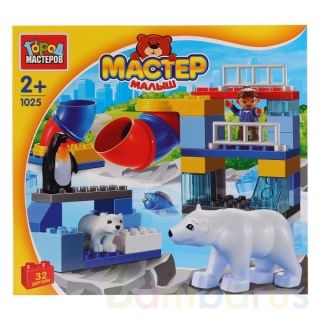 КОНСТРУКТОР "ГОРОД МАСТЕРОВ" БОЛЬШИЕ КУБИКИ: ЖИВОТНЫЕ СЕВЕРА, С ФИГУРКОЙ, 32 ДЕТ. В РУСС. КОР. в кор.36шт Конструктор серии "Мастер Малыш: Животные севера" предназначен для самых маленьких строителей. В набор входит 32 крупных детали, сделанных из прочного, безопасного пластика, окрашенных в яркие цвета. Их удобно держать в маленьких ручках и плотно соединять между собой. Из деталей можно собрать игровую станцию с горкой, белых медведей, пингвина и человечка, чтобы потом играть с ними или пополнить коллекцию. Развивает мелкую моторику, воображение, усидчивость, объясняет понятия "форма, цвет, объём", улучшает пространственное мышление. Совместим с наборами конструкторов других производителей. Рекомендовано детям от 2 лет.