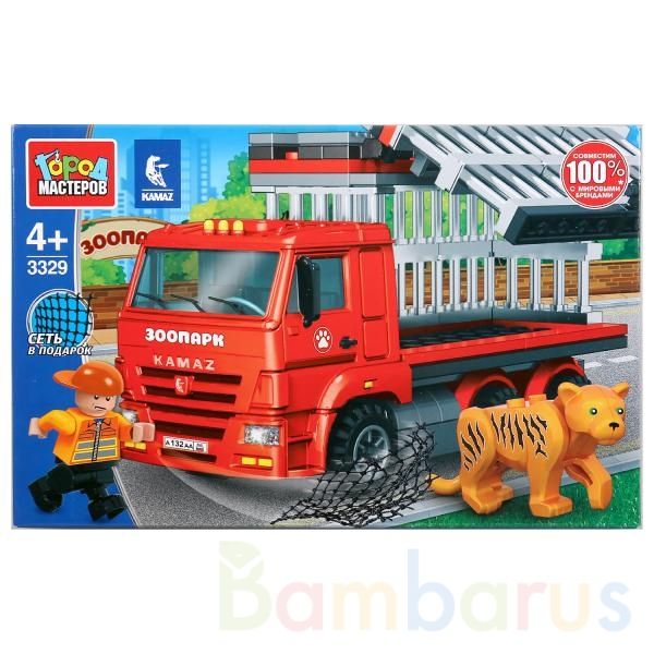 Конструктор «КАМАЗ с клеткой: побег тигра» из серии «Город» ТМ «Город мастеров» с фигурками вдохновит детей на новые сюжеты для игр. Набор станет гордостью игрушечной коллекции ребёнка.