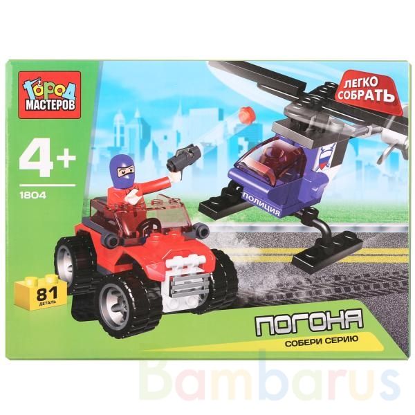 Из 81 пластиковой детали данного конструктора можно собрать целый сюжет под название "Погоня". Конструирование такого набора увлечет ребенка, а собрав его, он сможет играть в любые игры, связанные с полицией. В наборе так же есть фигурка преступника, что сделает игру более увлекательной. Развивает мелкую моторику рук, фантазию, усидчивость. Рекомендовано для детей от 4-х лет. Совместим с моделями конструкторов мировых производителей.