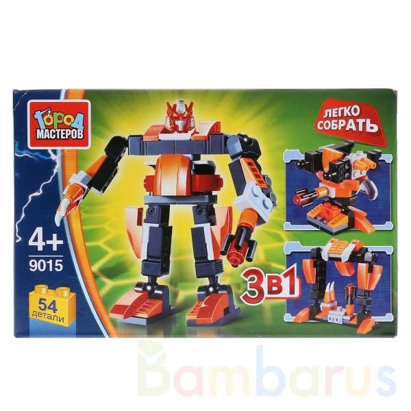 Конструктор из новой серии "Легко собрать" - это робот 3 в 1. В набор входит 54 детали, выполненных из прочной пластмассы. Они окрашены в оранжевый, чёрный и серый цвета безопасным составом и прочно соединяются между собой. Из деталей можно собрать трёх разных роботов, чтобы играть с ними весь день…
