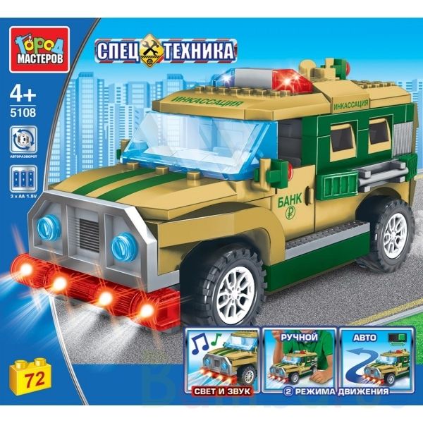 С помощью этого занимательного конструктора маленький любознайка сможет собрать яркую и функциональную инкассаторскую машинку, которая онащена световыми и звуковыми эффектами, а также способна двигаться в режиме «авто» и делать авторазворот. Набор вдохновит ребёнка на новые увлекательные сюжеты для игр и станет гордостью его игрушечной коллекции.