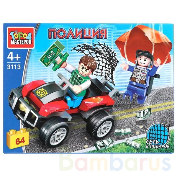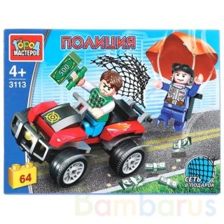 Конструктор «Полицейская погоня на парашюте» ТМ «Город мастеров» из серии «Полиция» вдохновит малыша на новые сюжеты для игр и станет гордостью игрушечной коллекции ребёнка. Хитрый грабитель с крупной суммой денег сбегает от погони на квадроцикле. Но далеко ему не уйти, он уже почти пойман в крепкие сети отважного полицейского на парашюте!