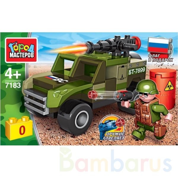 Конструктор «Военный джип» ТМ «Город мастеров» понравится маленьким героям.Особенности и комплектация:- 71 деталь- фигурка- флаг в подарок- оружие стреляет- совместим с моделями конструкторов мировых брендов- все детали легко и плотно соединяются между собойС помощью этого занимательного конструкто…