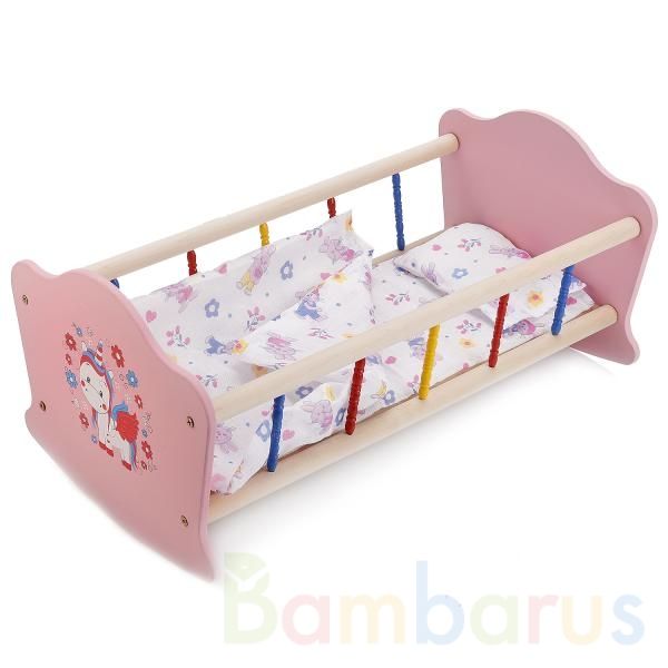 С кроваткой "Милый пони" девочка сможет укладывать любимую куклу спать, не беспокоясь о её комфорте. В набор входит деревянная кроватка, простынка, одеяло и подушка. Комплект постельного белья украшен зайчиками и цветочками. Спинки сделаны в изогнутой форме, чтобы можно было качать и убаюкивать игр…