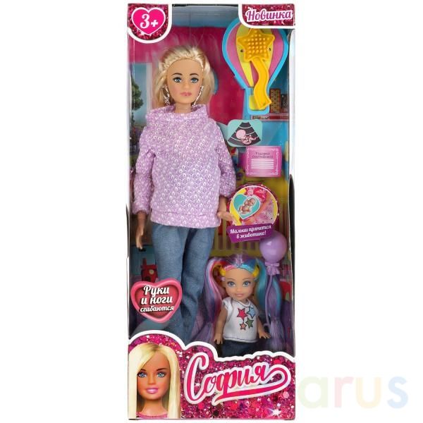 Будущая мама София одета в удобный сиреневый свитер и джинсы. Образ куколки дополняют модные крупные серьги. Её старшая малышка предпочла джинсы и футболку с ярким принтом. Одежду и аксессуары легко снять и надеть. С такими модными куклами девочке будет интересно и весело играть: благодаря тому, что руки и ноги Софии подвижны, им можно придать любое положение. У кукол длинные красивые волосы, которые хозяйка куклы сможет заплетать в разные причёски. Детально проработанный дизайн игрушки вдохновит девочку на новые игровые сюжеты.