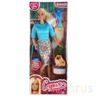 Модница-София одета в пушистый голубой свитер и серебристую юбку из блестящих пайеток. Образ дополняют стильные крупные серьги и элегантная сумочка. Одежду и аксессуары легко снять и надеть. С такой модной куклой девочке будет интересно и весело играть: благодаря тому, что руки и ноги куклы подвижны, им можно придать любое положение. У Софии длинные красивые волосы, которые хозяйка куклы сможет заплетать в разные причёски. Детально проработанный дизайн игрушки вдохновит девочку на новые игровые сюжеты.