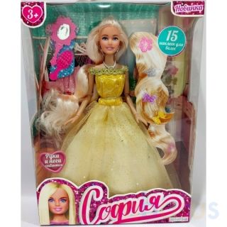 Модница София одета в роскошное бальное платье в жёлто-золотых тонах с элегантным декором, образ дополнен крупными серьгами и колье. С такой модной куклой девочке будет интересно и весело играть: благодаря тому, что руки и ноги куклы подвижны, им можно придать любое положение. У Софии длинные красивые волосы, которые хозяйка куклы сможет заплетать в разные причёски. Детально проработанный дизайн игрушки вдохновит девочку на новые игровые сюжеты.