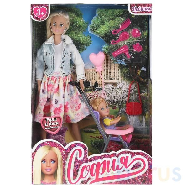 Модница София одета роскошную юбку с цветочным принтом, белую кофточку и приталенную джинсовку, образ дополняют крупные серьги. А её малышка предпочла сиреневую футболку с жёлтыми рукавами и ярко-розовые брючки. Одежду и аксессуары легко снять и надеть. С такими модными куклами девочке будет интересно и весело играть: благодаря тому, что руки и ноги Софии подвижны, им можно придать любое положение. У кукол длинные красивые волосы, которые хозяйка куклы сможет собирать в разнообразные причёски. Детально проработанный дизайн игрушек вдохновит девочку на новые игровые сюжеты.