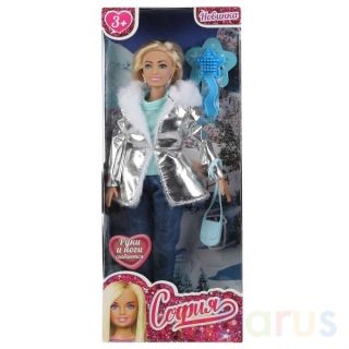 София одета в модные джинсы, голубую водолазку и серебристую парку с белым мехом. Образ куколки дополняют стильные серьги и сумочка. Одежду и аксессуары легко снять и надеть. С такой модной куклой девочке будет интересно и весело играть: благодаря тому, что руки и ноги куклы подвижны, им можно придать любое положение. У Софии длинные красивые волосы, которые хозяйка куклы сможет заплетать в разные причёски. Детально проработанный дизайн игрушки вдохновит девочку на новые игровые сюжеты.